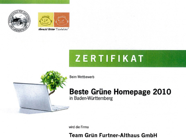 WeiterlesenUnsere Homepage wurde beim Wettbewerb "Beste Grüne Homepage 2010 - in Baden-Württemberg" für herausragende Leistungen ausgezeichnet